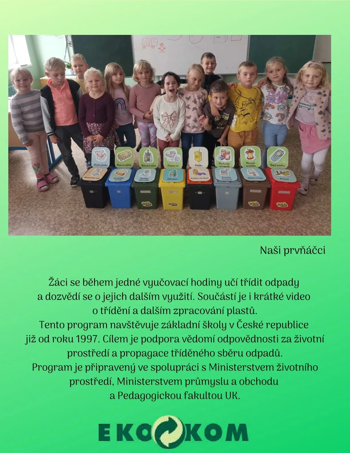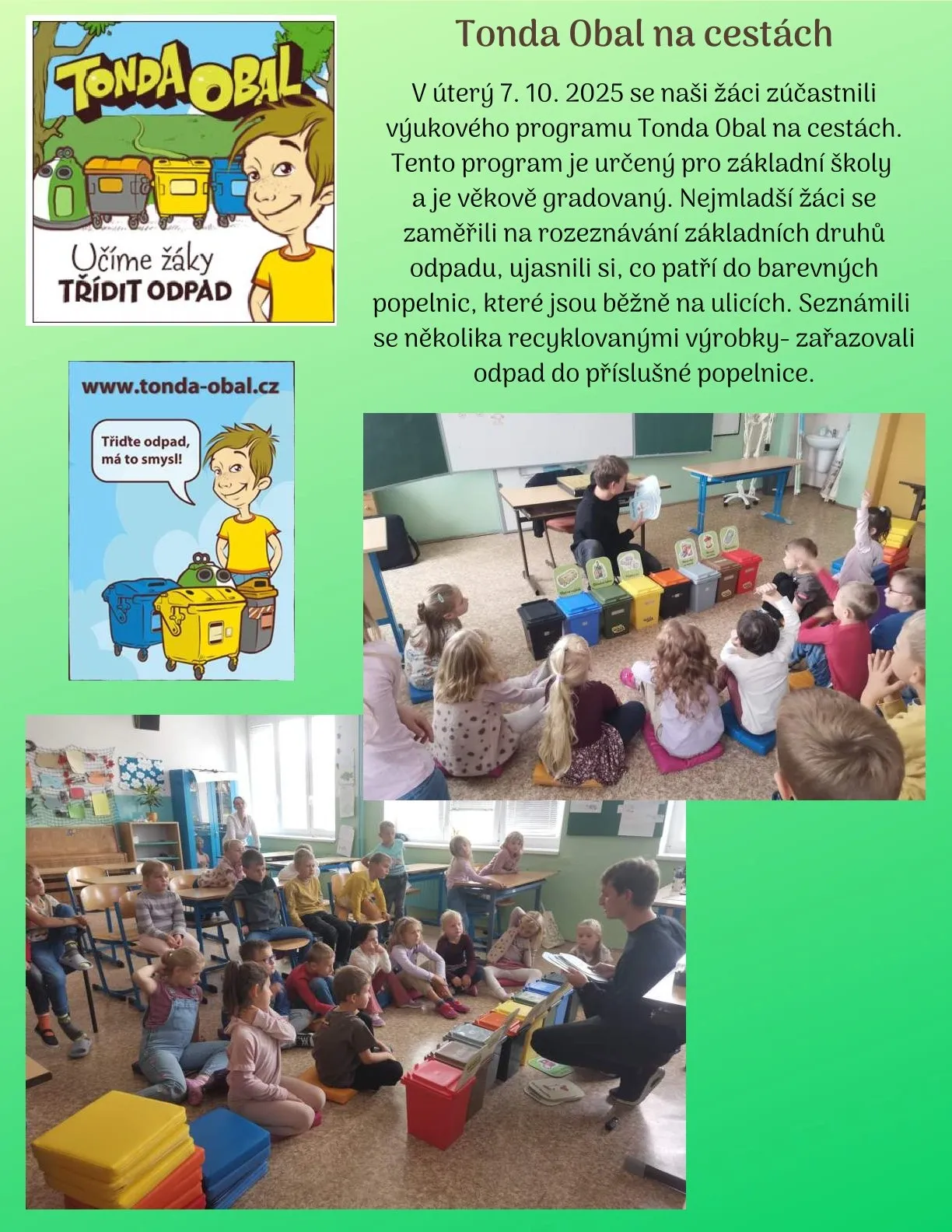 V úterý 7. 10. 2025 se naši žáci zúčastnili výukového programu Tonda Obal na cestách. Tento program je určený pro základní školy a je věkově gradovaný. Nejmladší žáci se zaměřili na rozeznávání základních druhů odpadu, ujasnili si, co patří do barevných popelnic, které jsou běžně na ulicích. Seznámili se několika recyklovanými výrobky- zařazovali odpad do příslušné popelnice