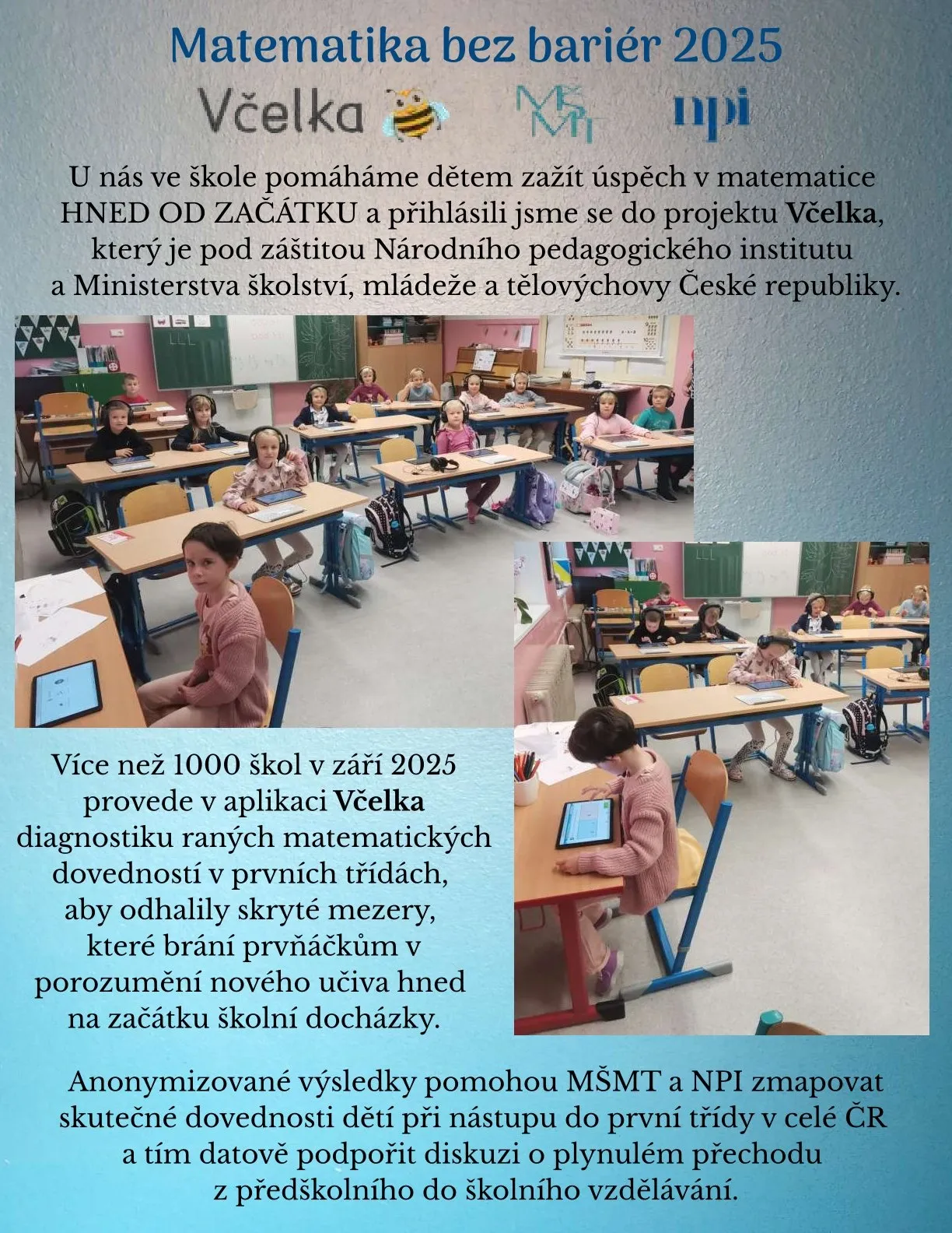 U nás ve škole pomáháme dětem zažít úspěch v matematice hned od začátku a přihlásili jsme se do projektu Včelka, který je pod záštitou Národního pedagogického institutu a Ministerstva školství, mládeže a tělovýchovy České republiky.