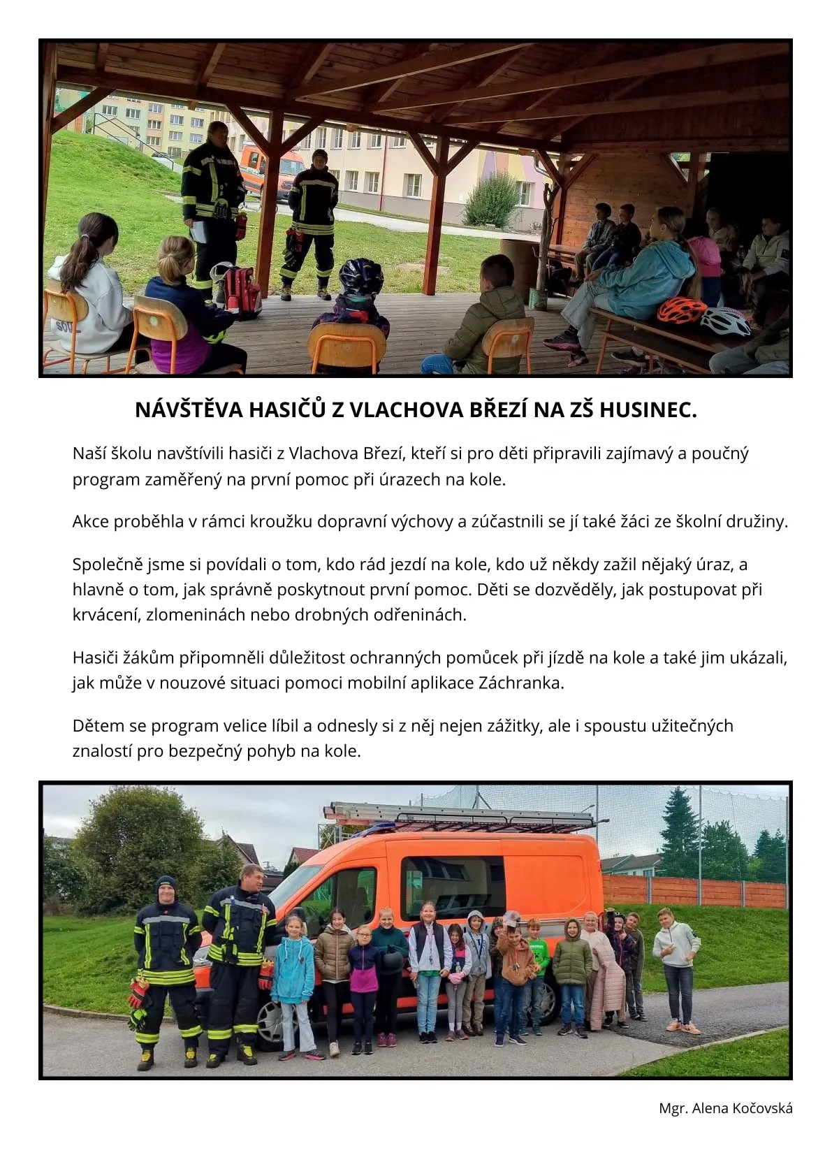 Naší školu navštívili hasiči z Vlachova Březí, kteří si pro děti připravili zajímavý a poučný program zaměřený na první pomoc při úrazech na kole.