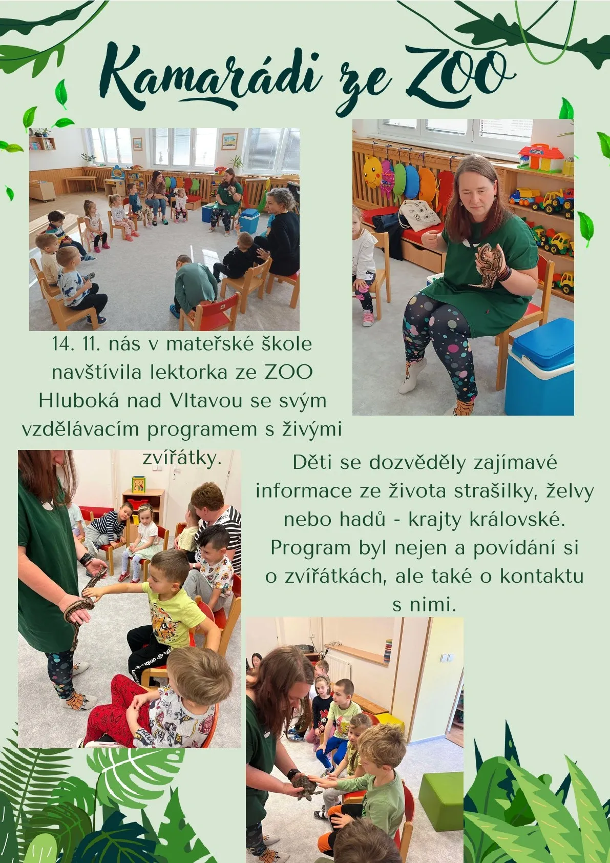 Dne 14. 11. nás v mateřské škole navštívila lektorka ze ZOO Hluboká nad Vltavou se svým vzdělávacím programem s živými zvířátky.
