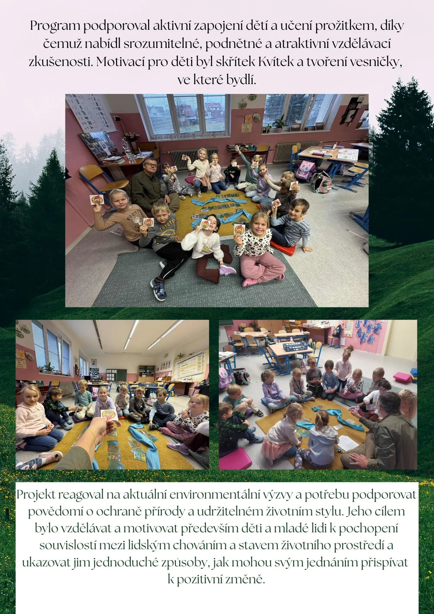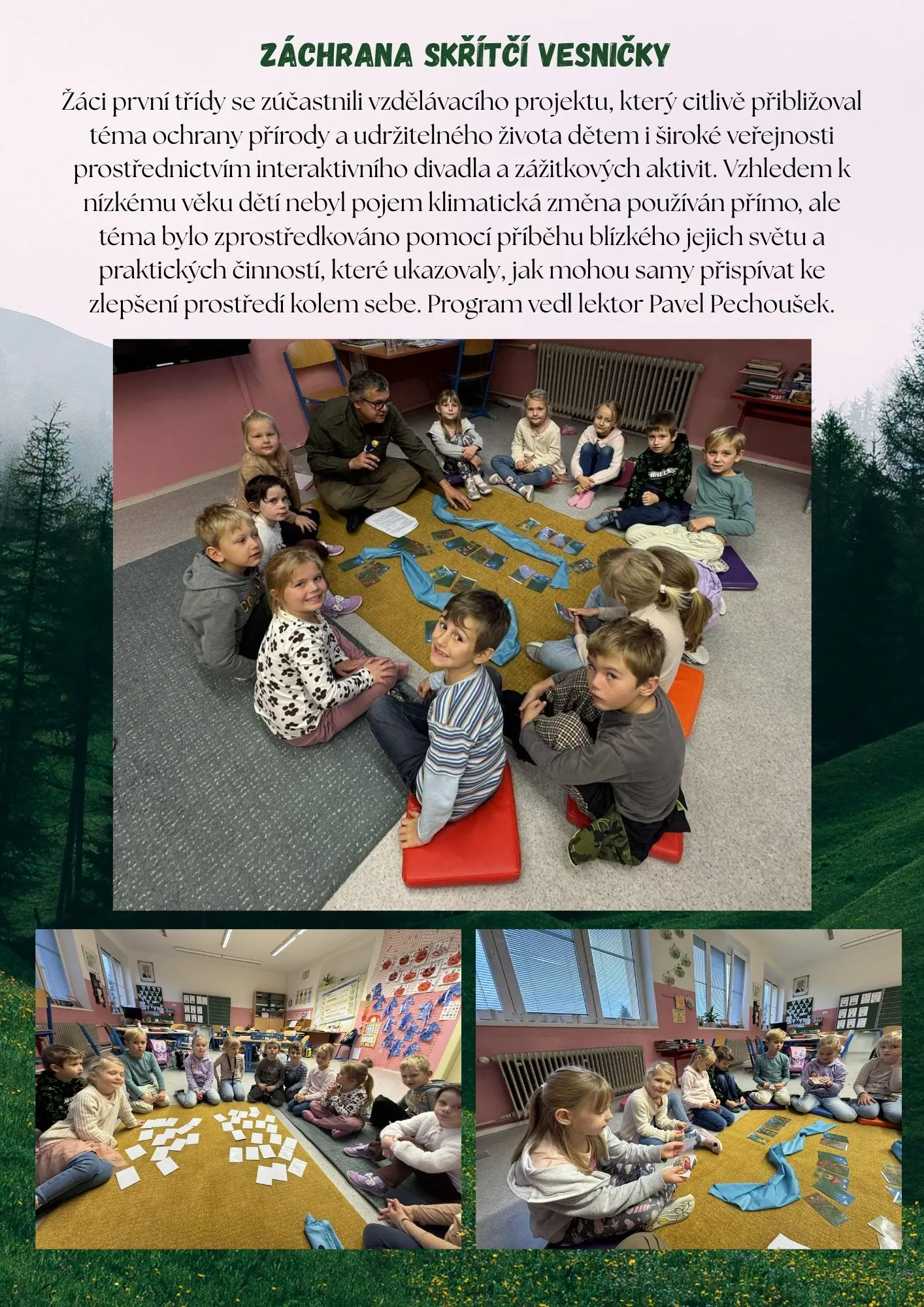 Žáci první třídy se zúčastnili vzdělávacího projektu, který citlivě přibližoval téma ochrany přírody a udržitelného života dětem i široké veřejnosti prostřednictvím interaktivního divadla a zážitkových aktivit.