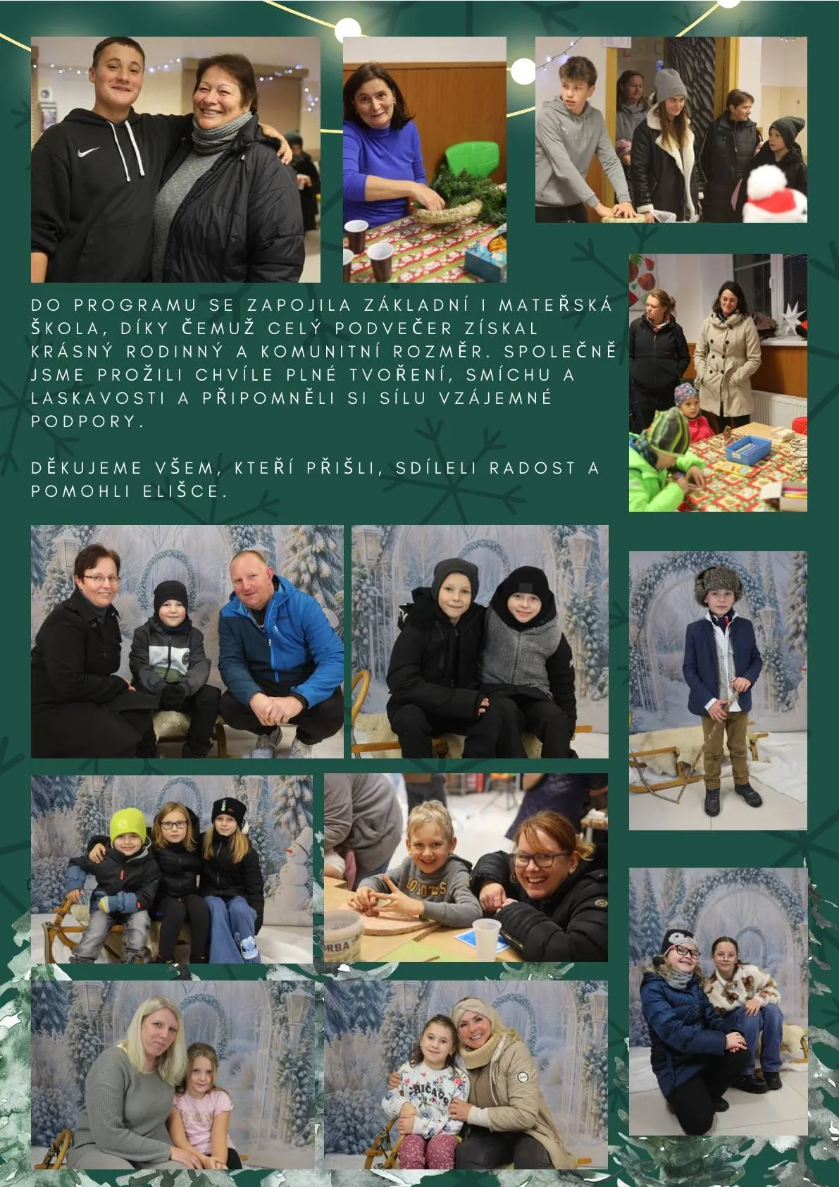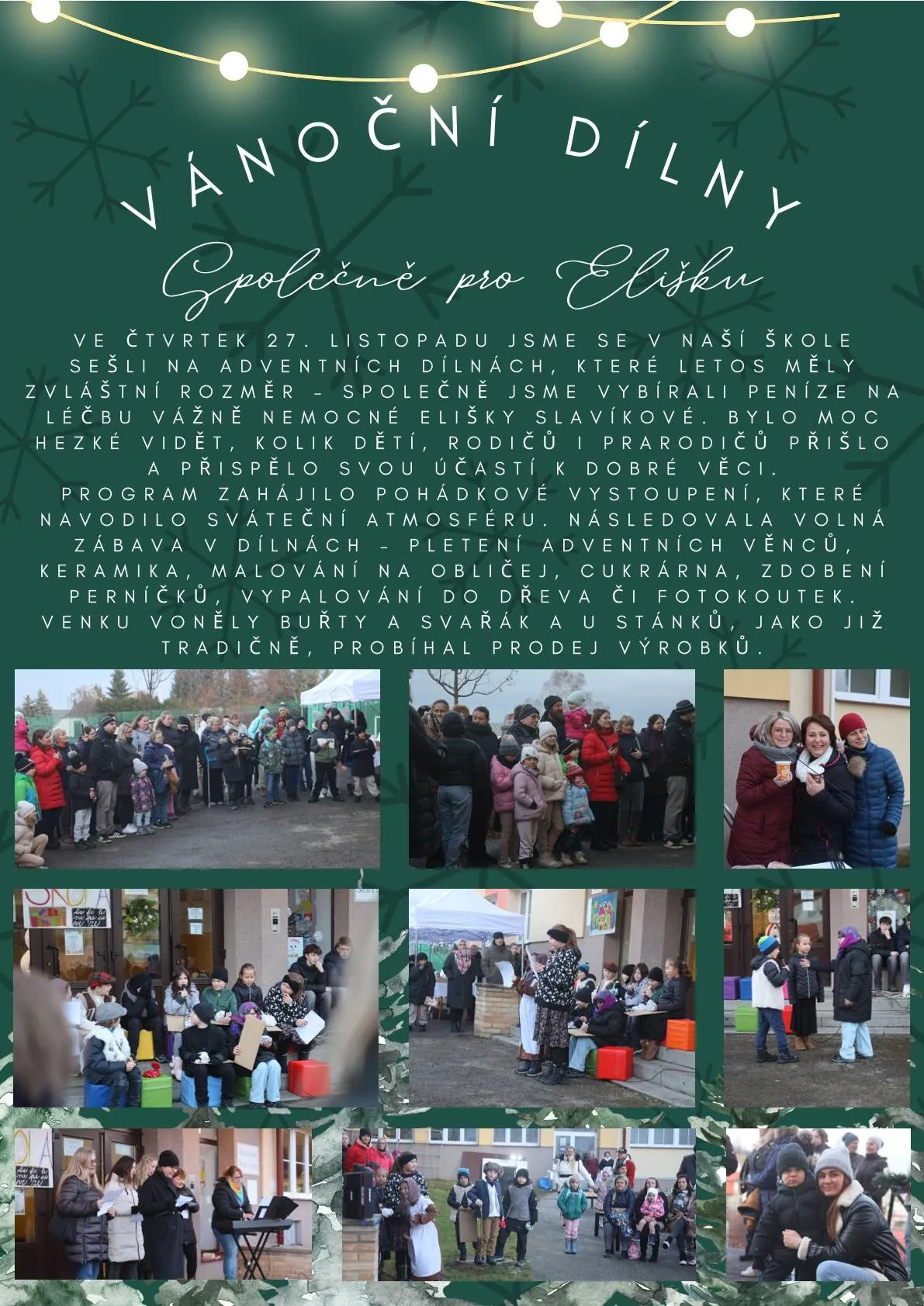 Ve čtvrtek 27.11. jsme se v naší škole sešli na adventních dílnách, které letos měly zvláštní rozměr. Společně jsme vybírali peníze na léčbu vážně nemocné Elišky Slavíkové.